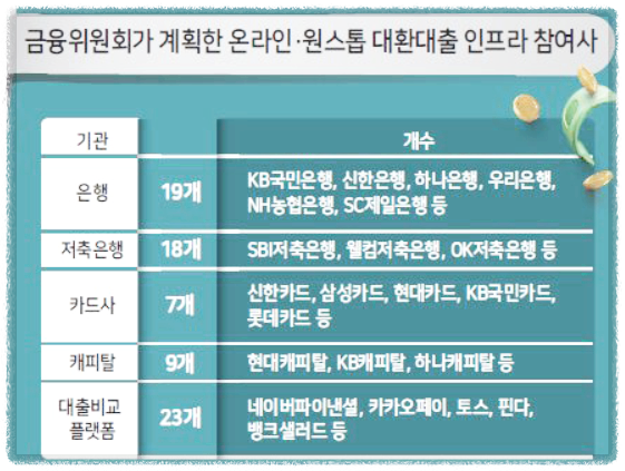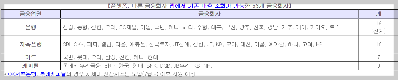 현재은행 19곳, 저축은행 18곳, 카드 7곳, 캐피탈사 9곳등금융사 53곳과 토스·카카오페이·네이버파이낸셜등 23개 대출비교 플랫폼업체가 인프라에 참여했습니다.
