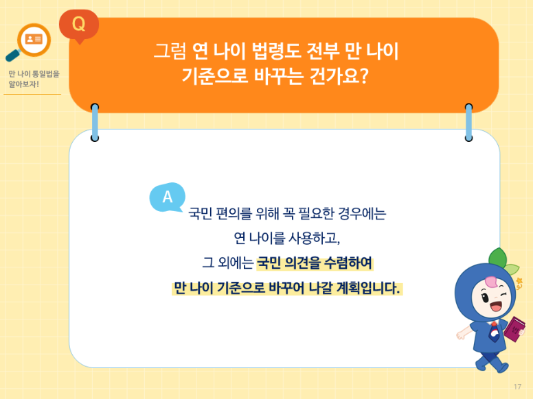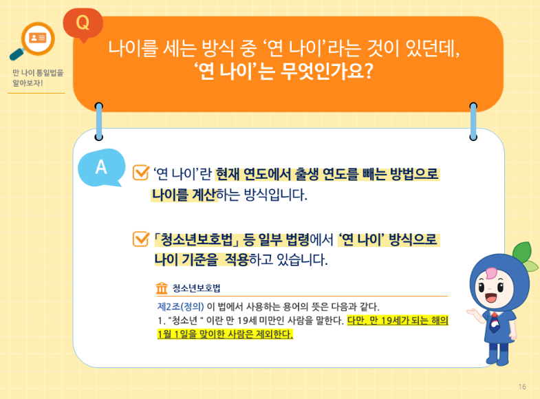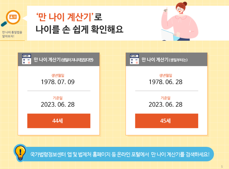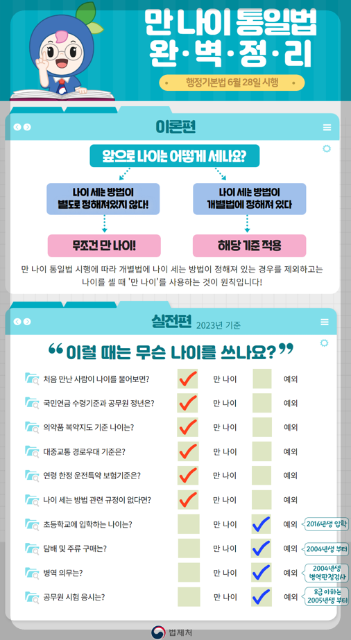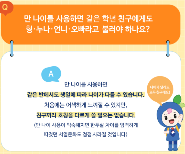 ※ 법제처에서는 학급 내 호칭 관련 혼선 방지를 위해 교육부 및 시도교육청과 협력하여 각급학교에서 학생 대상 만 나이 사용 관련 교육이 적극적으로 이루어지도록 준비하고 있다고 합니다.