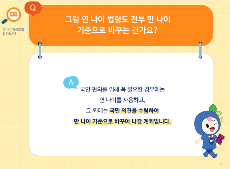 국민편의를위해꼭필요한경우는연나이를사용하고,그외에는국민의견을수렴하여만나이기준으로차츰바꾸어나갈계획이라고합니다.