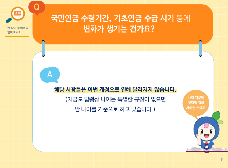 2. 국민연금 수령 기간, 노령연금 수급시기, 공무원 및 민간 정년, 65세 어르신 교통비 지원 연령 등에는 만 나이 시행 시에 도 변화가 생기지 않습니다. 지금도 법령상 나이는 특별한 규정이 없으면 만 나이를 기준으로 하고 있기 때문입니다.