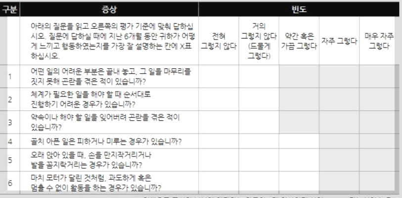 아래 자가진단테스트는 성인 adhd진단할 수 있는 검사가 아니고, 성인 adhd를 의심해 볼 수 있는