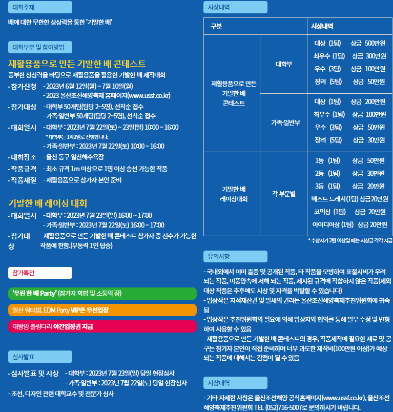 2023 울산조선해양축제 홈페이지(www.ussf.co.kr)에서 자세한 사항 참고하세요.