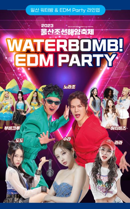 워터밤 & EDM 파티에 초대된 가수는 노라조, 부비크루, 허니비즈, 라라, 수라, 도도입니다.