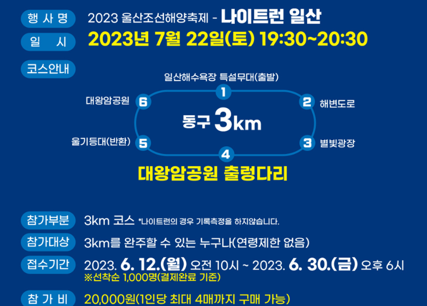 나이트런 일산은 일산해수욕장 특설무대에서 대왕암공원 출렁다리까지 3㎞ 코스를 야간에 달리는 경기입니다.