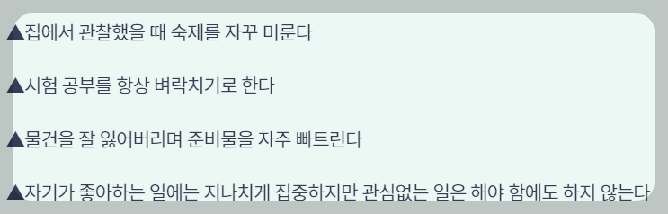■주의력 결핍: 긴 시간 동안 한 가지 일에 집중하는 것이 어려워 주의력이 흩어지거나 분산되는 경향이 있습니다.