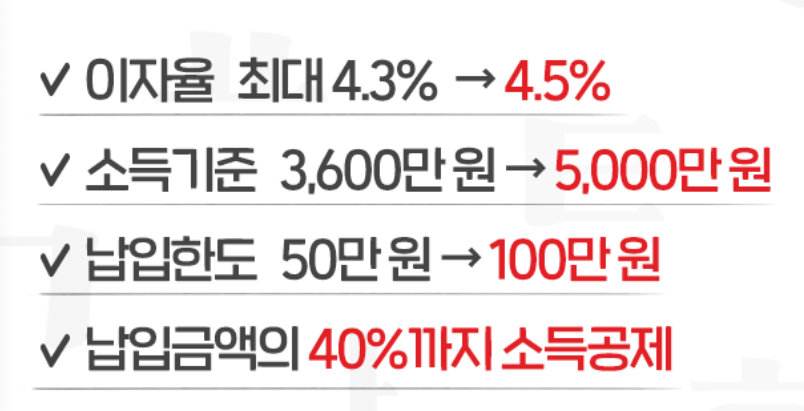 근로소득 연 3천600만원, 종합소득 연 2천600만 원 이하 가입자에게는 이자소득을 500만 원까지 비과세를 적용해 준다고 합니다.